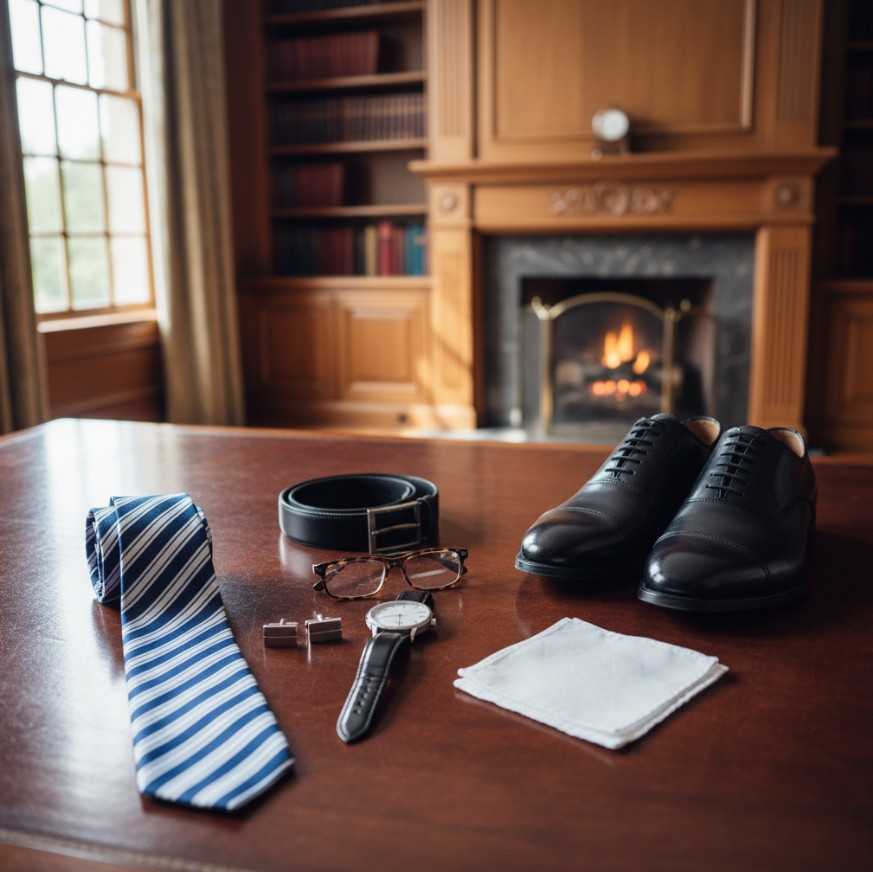 - Neckwear: You should invest in several high-quality silk ties. Your core collection should include solid choices in navy and rich burgundy, as well as classic, conservative patterns like pin-dots or subtle stripes. The knot should always be neat—a four-in-hand or half-Windsor is ideal—and sit snugly against your shirt collar, with the tip just touching your belt buckle.