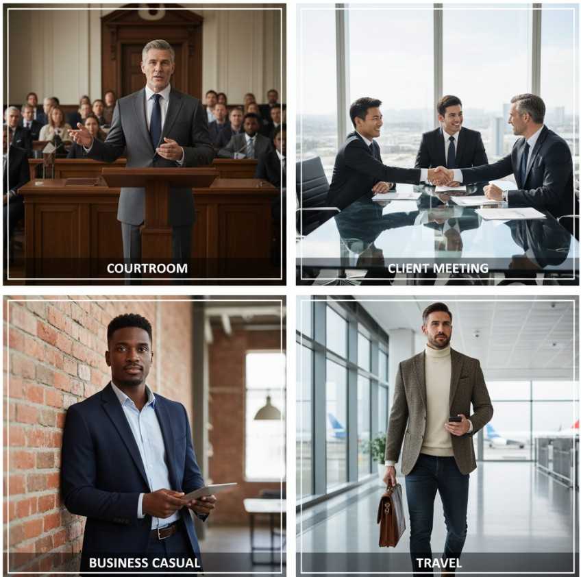 A seasoned lawyer understands that adapting their strategy for different contexts is key to success. This same nuanced intelligence should be applied to their wardrobe choices to ensure their appearance is always correctly calibrated to the situation. Below is a summary of how to approach key legal environments.